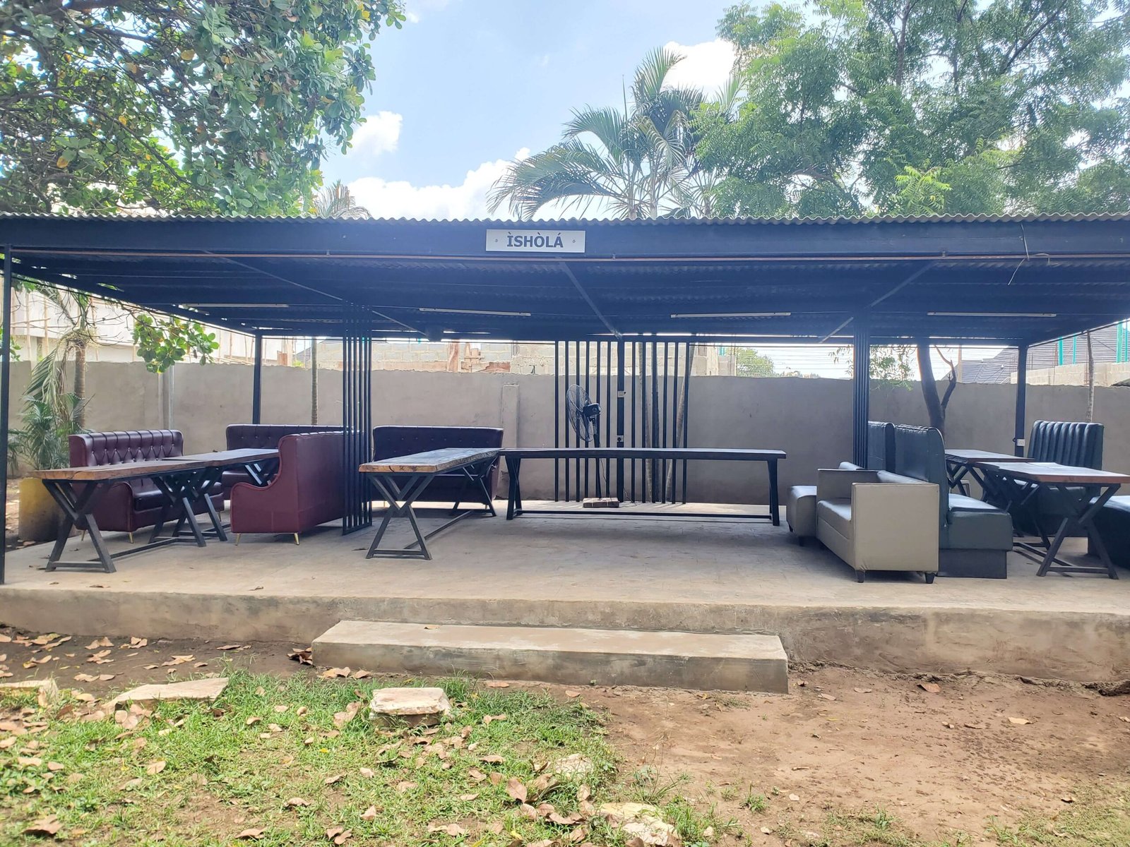 The structure features sturdy, dark wood columns and a subtly peaked roof that provides cooling shade, its design drawing inspiration from the welcoming courtyards of traditional Yoruba compounds.