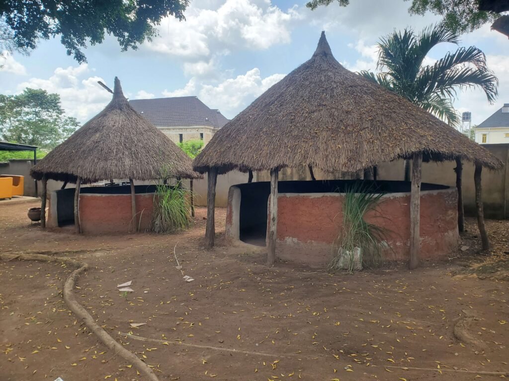 The structure features sturdy, dark wood columns and a subtly peaked roof that provides cooling shade, its design drawing inspiration from the welcoming courtyards of traditional Yoruba compounds.